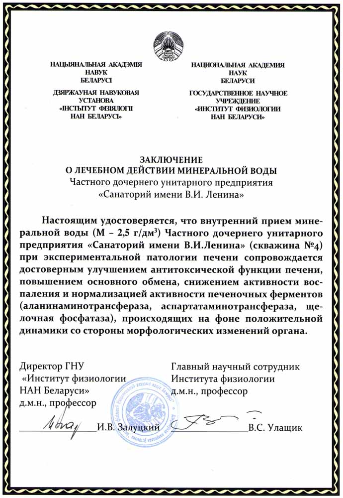 Минеральная вода из источника № 4 достоверно улучшает антитоксическую функцию печени. Снижает повышенные ферменты печени (аланинаминотрансферазу, аспартатаминотрансферазу и щелочную фосфатазу), а значит, снимает воспаление и восстанавливает клетки печени.