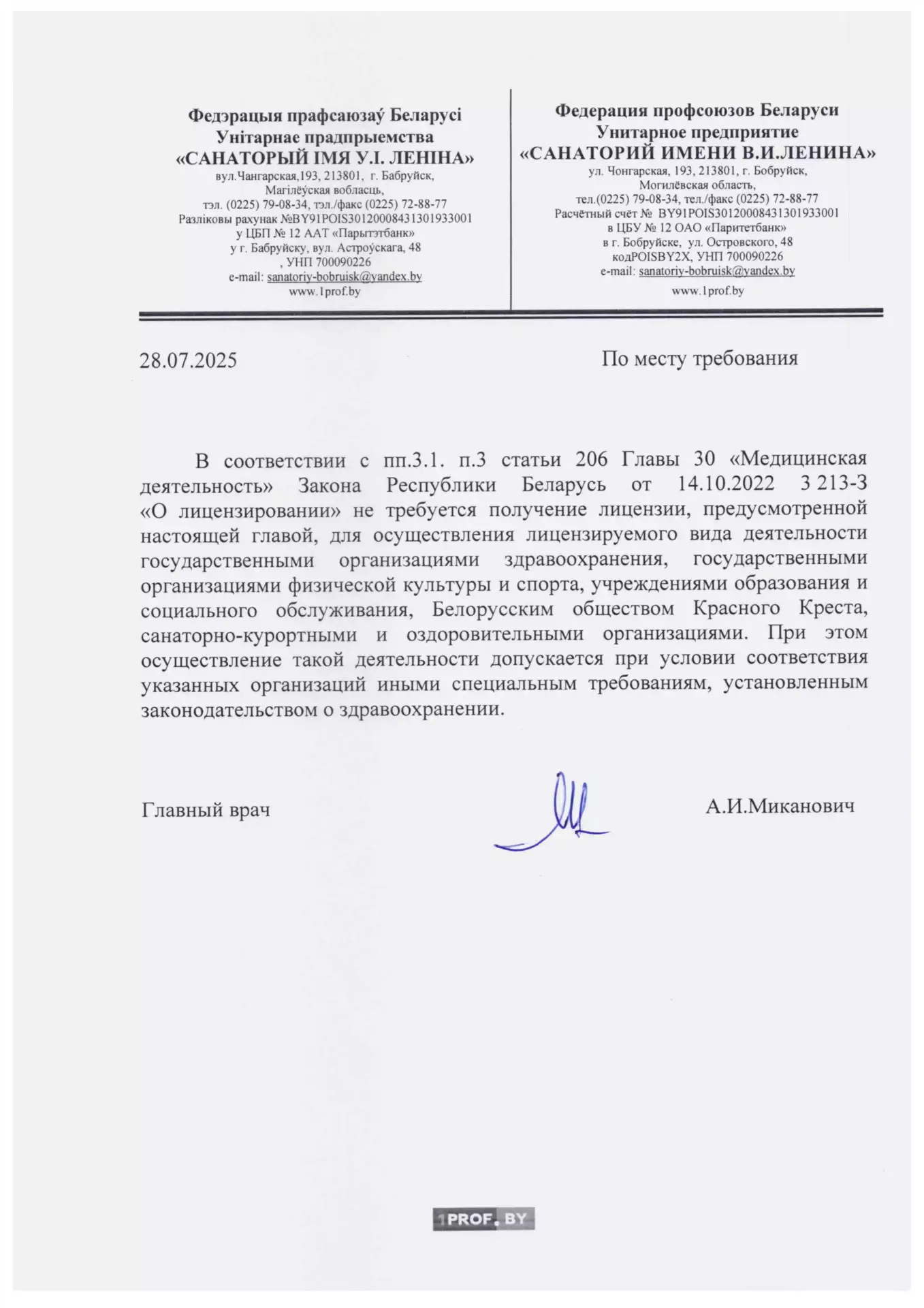 Исполнитель – Дочернее унитарное предприятие “Санаторий имени В.И. Ленина” (сокращенное наименование – Унитарное предприятие “Санаторий имени В.И. Ленина”), зарегистрированное решением Бобруйского городского исполнительного комитета от 18 марта 2014 года в Едином государственном регистре юридических лиц и индивидуальных предпринимателей за № 700090226, специальное разрешение (лицензия) на право осуществления медицинской деятельности № 02040/724 от 27.12.1999 года (действительна до 27.12.2024 г.), юридический/почтовый адрес: Республика Беларусь, г. Бобруйск, ул. Чонгарская, 193, официальный сайт – www.санаторийленина.бел.
